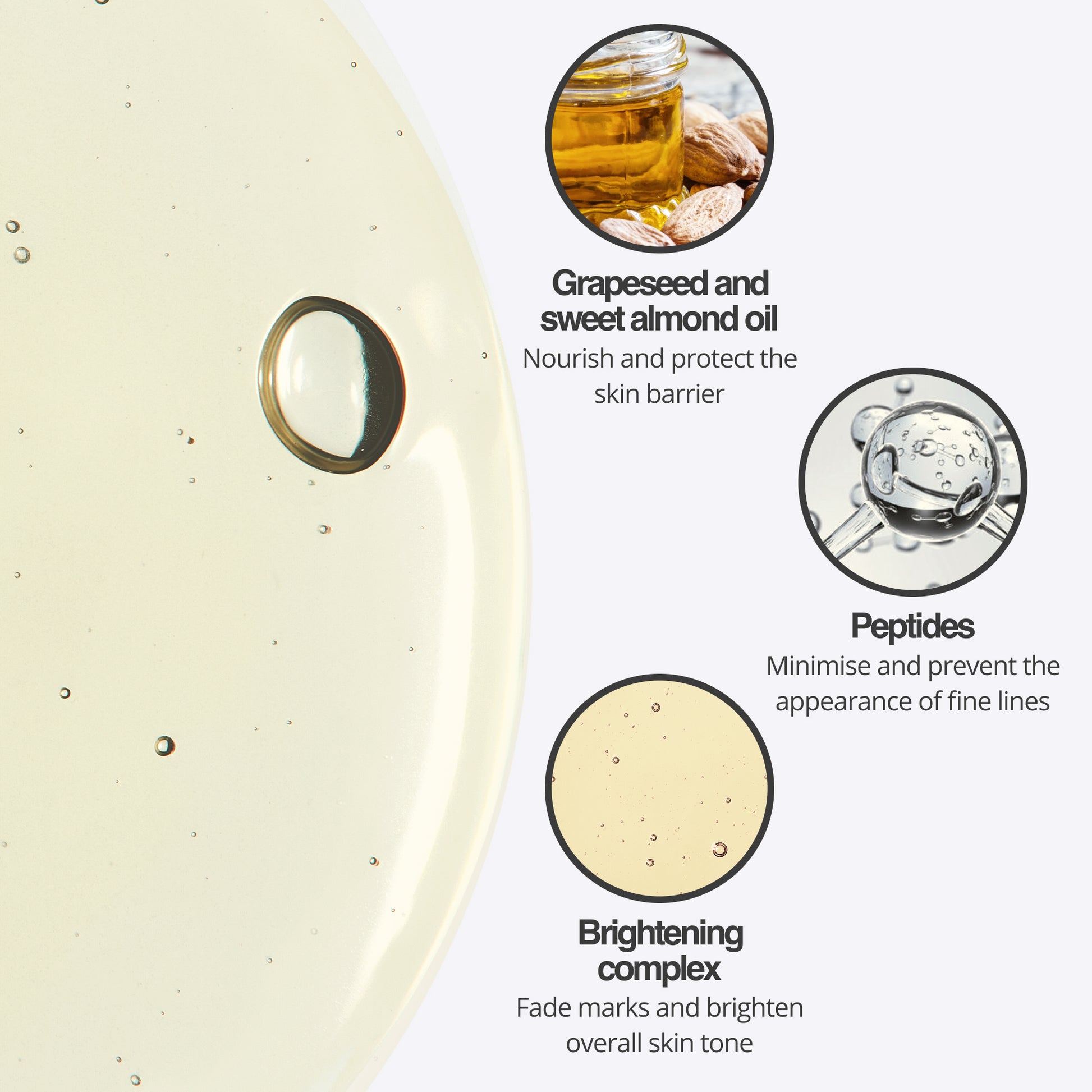 Base d'huile de pépins de raisin et d'amande douce : Riche en acide linoléique, elle aide à maintenir les niveaux d'hydratation de la peau et l'apparence de rondeur, protégeant ainsi la barrière cutanée essentielle.