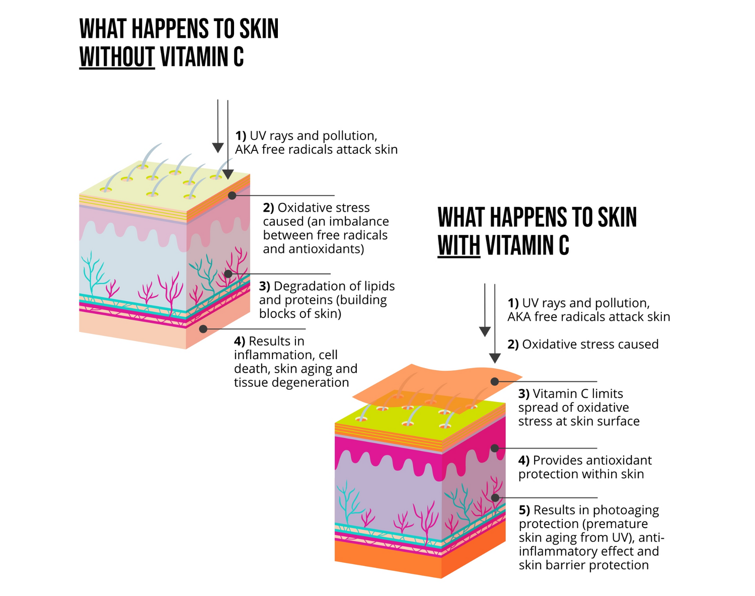 Het is bekend dat de pure vorm van vitamine C, ascorbinezuur, onstabiel is en zeer gevoelig voor oxidatie (waardoor het bruin wordt) via hitte, licht, lucht en water, wat de effectiviteit ervan beïnvloedt. Het gebruik van stabielere derivaten van vitamine C in onze formule zorgt ervoor dat de oxidatiesnelheid wordt vertraagd, wat minder verkleuring en een langere houdbaarheid betekent, zodat uw huid langer van alle geweldige voordelen van vitamine C kan profiteren.